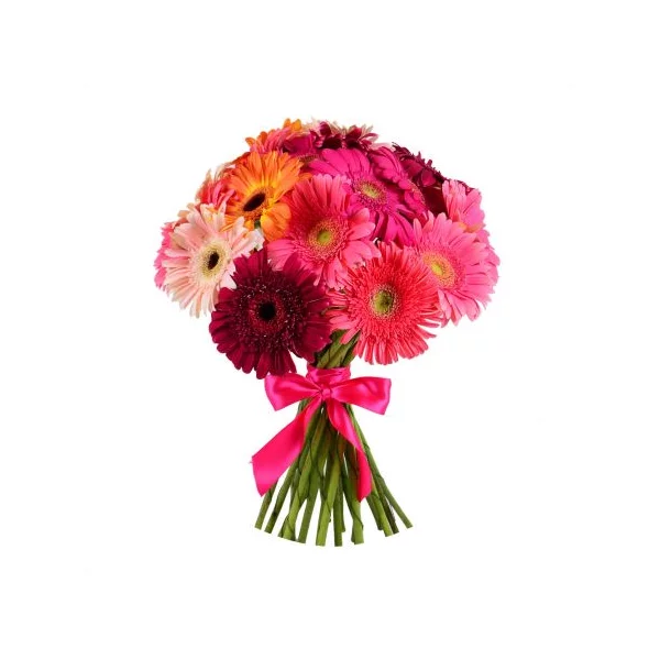 Стандартный: гербера разноцветная (бордовая, красная, розовая, оранжевая) - 11 шт., бант розовый.