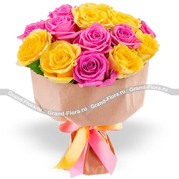 Букет создан из желтых роз и розовых роз сорта Аква, необычное сочетание цвета, придает всей композиции необъяснимую свежесть и притягательность. Стильная крафтовая упаковка и лента в цвет букета, ставит финальный аккорд в концепте букета. Размер зависит от выбранного Вами количества роз. Обращаем Ваше внимание, что состав и оформление букета могут отличаться.