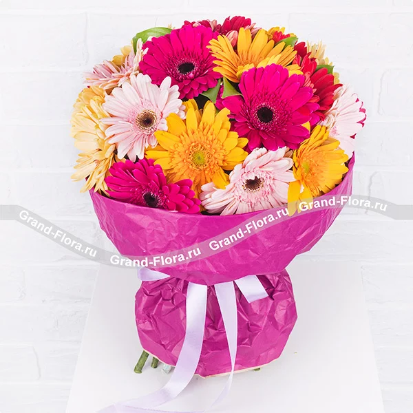 поможет солнечное сочетание пестрых гербер. Нежно розовый цвет намекнет о симпатии, желтый о дружеском интересе, оранжево-красный станет комплиментом, а насыщенно-розовый